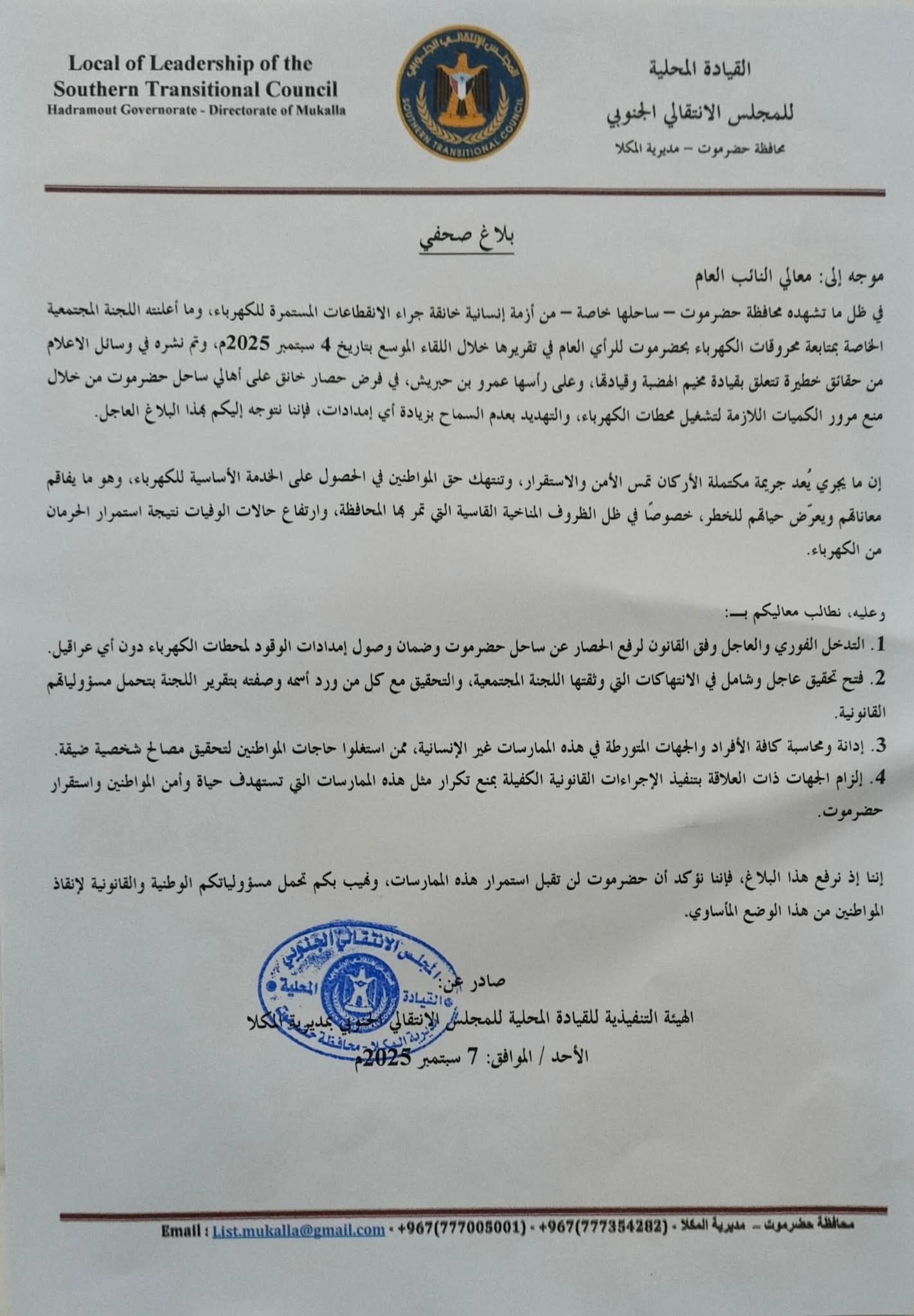 في ظل ما تشهده محافظة حضرموت – ساحلها خاصة – من أزمة إنسانية خانقة جراء الانقطاعات المستمرة للكهرباء، وما أعلنته اللجنة المجتمعية الخاصة بمتابعة محروقات الكهرباء بحضرموت للرأي العام في تقريرها خلال اللقاء الموسع بتاريخ 4 سبتمبر 2025م، وتم نشره في وسائل الاعلام من حقائق خطيرة تتعلق بقيادة مخيم الهضبة وقيادتها، وعلى رأسها عمرو بن حبريش، في فرض حصار خانق على أهالي ساحل حضرموت من خلال منع مرور الكميات اللازمة لتشغيل محطات الكهرباء، والتهديد بعدم السماح بزيادة أي إمدادات، فإننا نتوجه إليكم بهذا البلاغ العاجل.
