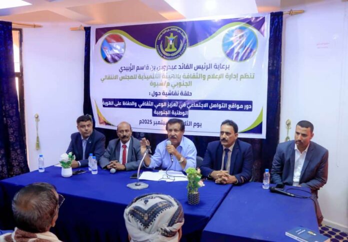 نظّمت إدارة الإعلام والثقافة بالهيئة التنفيذية للقيادة المحلية للمجلس الانتقالي الجنوبي بمحافظة شبوة، اليوم الثلاثاء، حلقة نقاشية بعنوان: “دور مواقع التواصل الاجتماعي في تعزيز الوعي الثقافي والحفاظ على الهوية الوطنية الجنوبية”، بحضور أعضاء فريق التوجيه والرقابة الرئاسي.