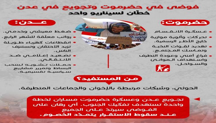 يتوازى ذلك مع تصعيد إعلامي مكثّف ضد المجلس الانتقالي الجنوبي وكياناته المدنية والعسكرية. وبحسب مراقبين، فإن شيطنة المكوّنات الجنوبية وتشويه صورتها يهدفان إلى سحب البساط من تحتها، لتمرير مشاريع سياسية لا تعبّر عن تطلعات أبناء الجنوب، بينها تقسيم الجنوب وإضعافه عبر تجزئة جغرافيته وقوّته الأمنية.