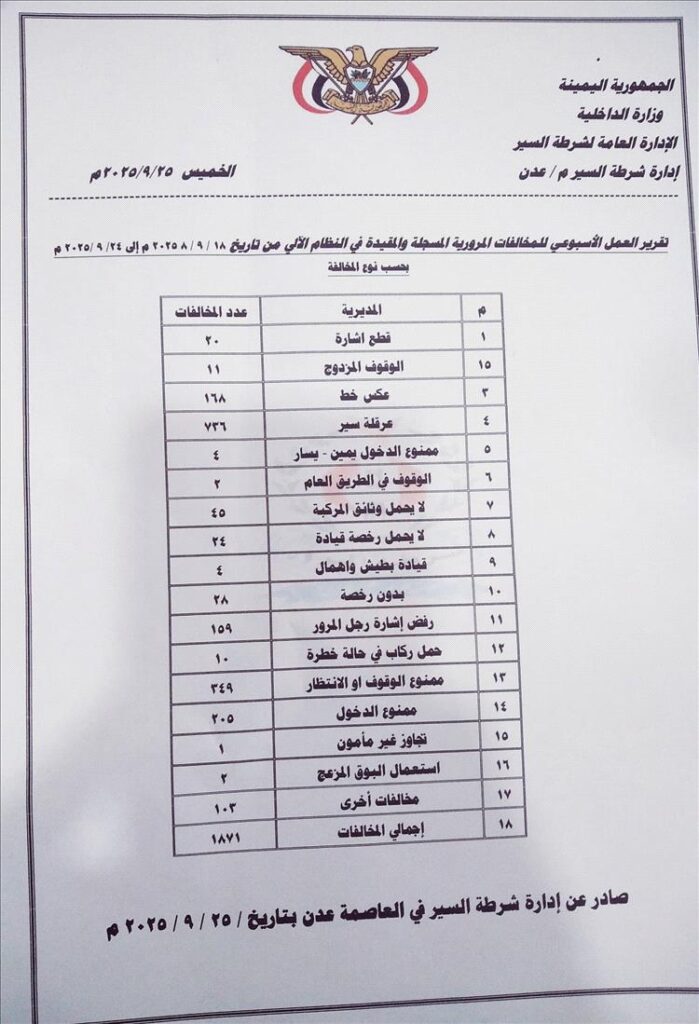 أعلنت شرطة السير في العاصمة عدن أن إجمالي المخالفات المرورية المسجَّلة خلال الفترة من 26 سبتمبر حتى 1 أكتوبر 2025م، بلغ (1971) مخالفة مرورية، بزيادة قدرها (90) مخالفة عن الأسبوع الماضي.