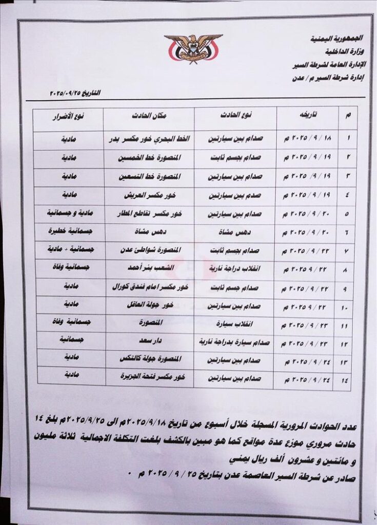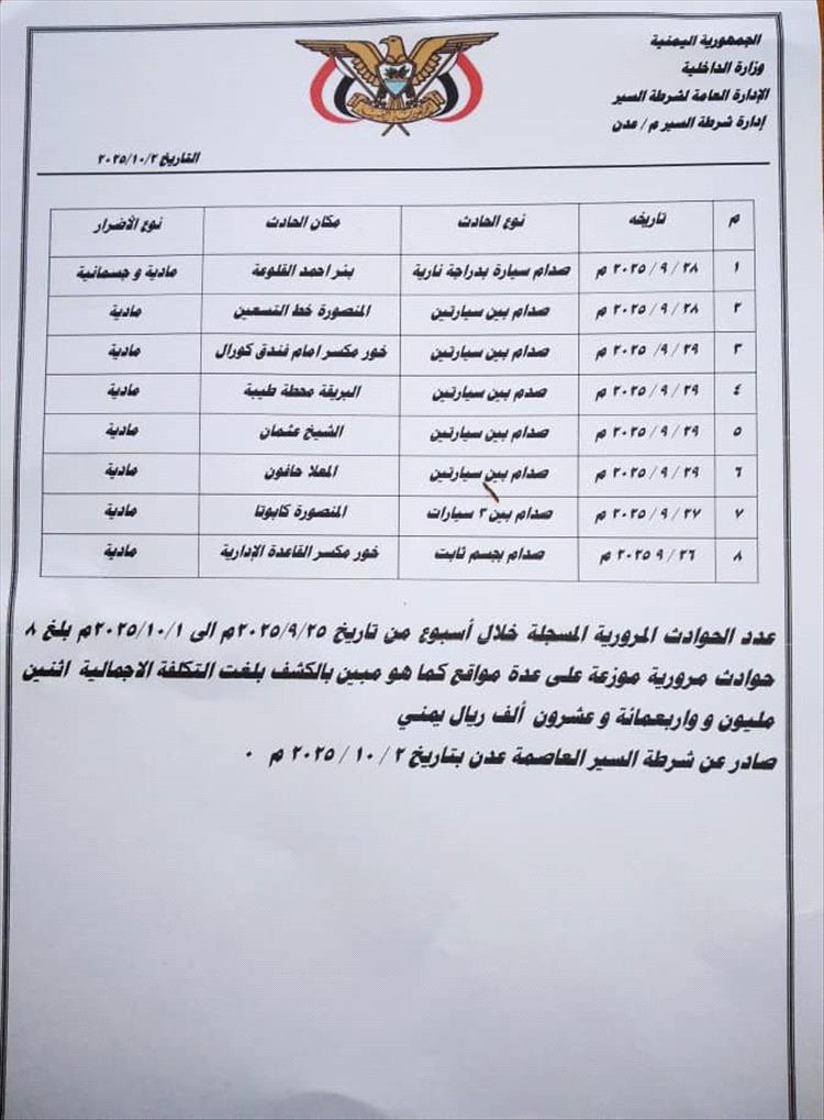 وفي ما يخص الحوادث المرورية، أوضحت الإحصائية أن العاصمة عدن شهدت خلال الفترة نفسها (8) حوادث مرورية في عدد من المديريات، مسجّلة انخفاضًا بنسبة 43% مقارنة بالأسبوع السابق، مع خسائر مادية تقدَّر بنحو 2,420,000 ريال (مليونين وأربعمائة وعشرون ألف ريال).