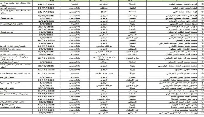 ووفقاً للمصادر، تضمنت الكشوفات المسربة أسماء عدد كبير من المعلمين والإداريين الذين تم اعتقالهم من مختلف مديريات المحافظة، دون أي مسوغات قانونية، فيما تم نقل بعضهم إلى جهات مجهولة، وسط تعتيم إعلامي تفرضه سلطات الحوثي لمنع تسريب تفاصيل الانتهاكات.