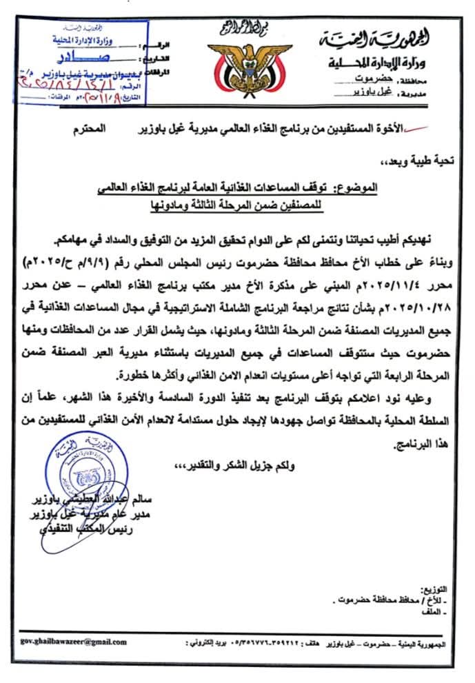 يأتي ذلك استناداً إلى خطاب محافظ حضرموت رئيس المجلس المحلي رقم (9/9/م ح/2025م) بتاريخ 4 نوفمبر 2025، المبني على مذكرة مدير مكتب برنامج الغذاء العالمي في عدن الصادرة بتاريخ 28 أكتوبر 2025، والمتعلقة بنتائج المراجعة الاستراتيجية الشاملة لبرامج المساعدات الغذائية في المديريات المصنفة ضمن المرحلة الثالثة وما دونها.