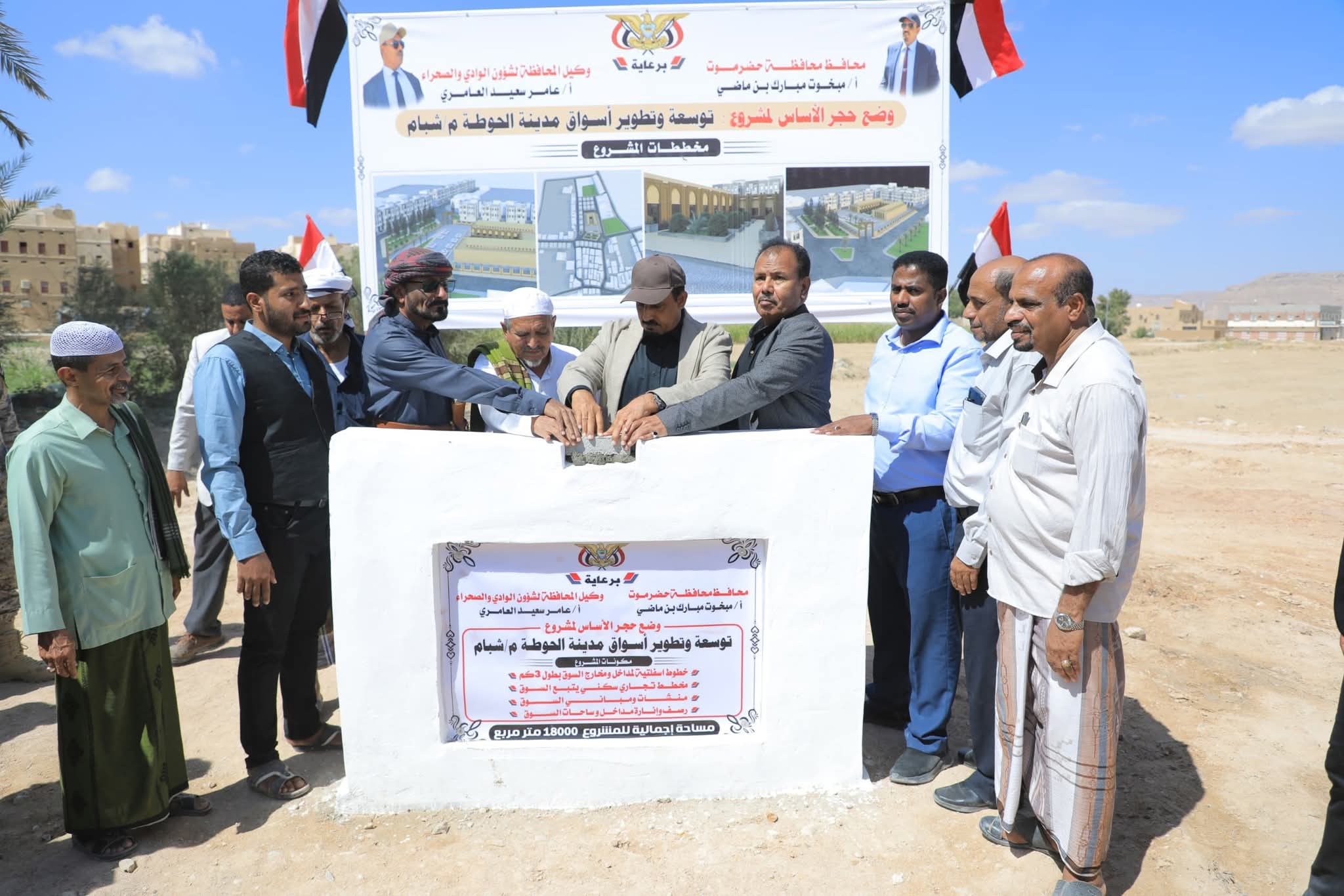 وضع محافظ حضرموت الأستاذ مبخوت مبارك بن ماضي، ومعه وكيل حضرموت لشؤون مديريات الوادي والصحراء الأستاذ عامر العامري، اليوم، حجر الأساس لمشروع تطوير أسواق مدينة الحوطة بمديرية شبام، بمساحة إجمالية تقدر بـ 18000 متر مربع، بتمويل من السلطة المحلية.