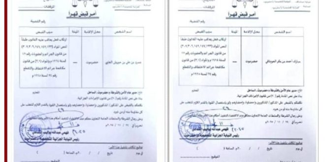 وتحمل الأوامر توقيع القاضي فهمي عبدالله الشدادي، رئيس النيابة الجزائية المتخصصة بحضرموت، والصادرة بتاريخ 29 نوفمبر 2025م.