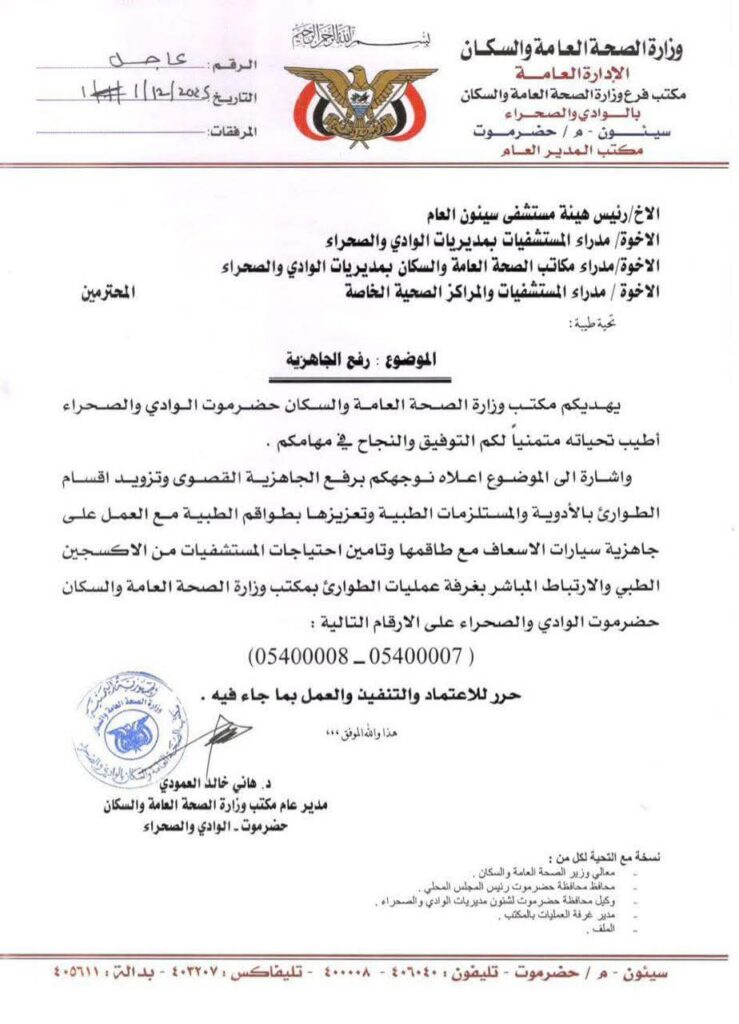 أصدر مكتب وزارة الصحة العامة والسكان بحضرموت الوادي والصحراء، توجيهاته لكافة المستشفيات والأقسام الطبية بضرورة رفع الجاهزية القصوى للطوارئ، وتزويد أقسام الطوارئ بالأدوية والمستلزمات الطبية اللازمة، وتعزيزها بالكوادر الطبية المؤهلة.