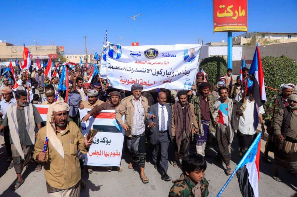 نظمت القيادة المحلية للمجلس الانتقالي الجنوبي بمحافظة شبوة، اليوم الأحد، مسيرة جماهيرية حاشدة في مدينة عتق، احتفاءً بالانتصارات التي حققتها القوات المسلحة الجنوبية ونجاح عملية “المستقبل الواعد” في تطهير وتحرير عارين بشبوة، ومديريات وادي وصحراء حضرموت.