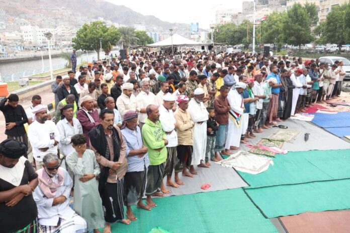 أدّى جموع من أبناء محافظة حضرموت، ظهر اليوم، صلاة “جمعة الثبات والتمكين” في ساحة الاعتصام بمدينة المكلا، بدعوة من القيادة المحلية للمجلس الانتقالي الجنوبي بالمحافظة، وذلك بحضور القائم بأعمال رئيس الهيئة التنفيذية للقيادة المحلية الأستاذ محمد صالح باتيس، وعدد من القيادات والشخصيات.