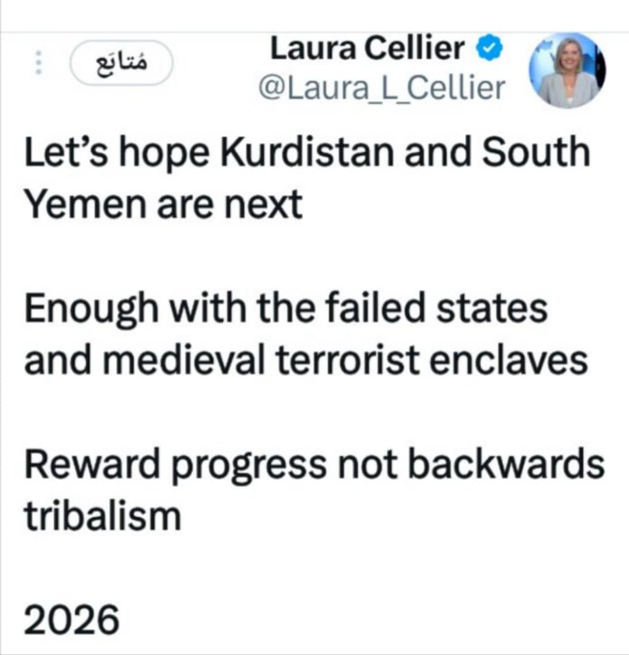 وأضافت، في تغريدة لها على حسابها الرسمي في منصة إكس إن العالم المتقدم يرفض اليوم القوى القبلية لأننا في عصر التقدم والعلوم وعلى الفاشيون أن يتوقفوا عن ظلم في جنوب اليمن وكوردستان.