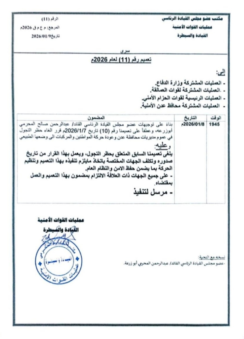ونص التعميم الصادر اليوم، على إلغاء العمل بالقرار السابق رقم (10) لعام 2026م بشأن حظر التجوال، ووجه الجهات المختصة والمعنية بمباشرة مهامها لتنظيم الحركة بما يضمن استدامة الأمن والنظام العام وتسهيل تنقلات المواطنين.