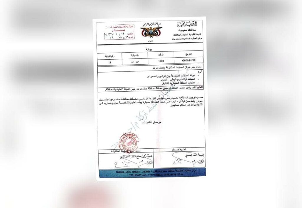 وحسب التعميم الصادر عن مكتب المحافظ والموجّه إلى عمليات الوادي والصحراء وقوات درع الوطن في الريان والمنطقة العسكرية الثانية، فإن السماح بدخول المسلحين يهدف إلى نقل مساجين، في خطوة يرى مراقبون أنها تتجاوز كامل البروتوكولات الأمنية وتكشف عن ضعف قيادة حضرموت أمام نفوذ قبائل مأرب.