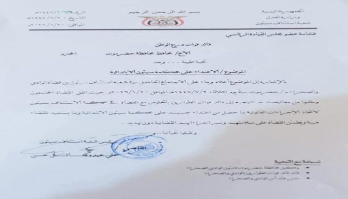 عقد قضاة الوادي والصحراء بمحافظة حضرموت، اليوم، اجتماعاً طارئاً في شعبة محكمة الاستئناف بمدينة سيئون، لمناقشة الاعتداء الذي تعرّضت له محكمة سيئون الإبتدائية من أحد أفراد قوات المتواجدة في سيئون، وما ترتب عليه من تداعيات خطيرة تمسّ أمن القضاة واستقلال القضاء.
