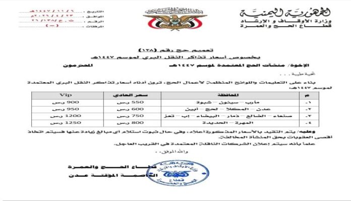 أصدرت وزارة الأوقاف والإرشاد، عبر قطاع الحج والعمرة، تعميماً جديداً بشأن تحديد أسعار تذاكر النقل البري للحجاج اليمنيين لموسم 1447هـ، في إطار تنظيم خدمات الحج وضمان الالتزام بالضوابط المعتمدة.